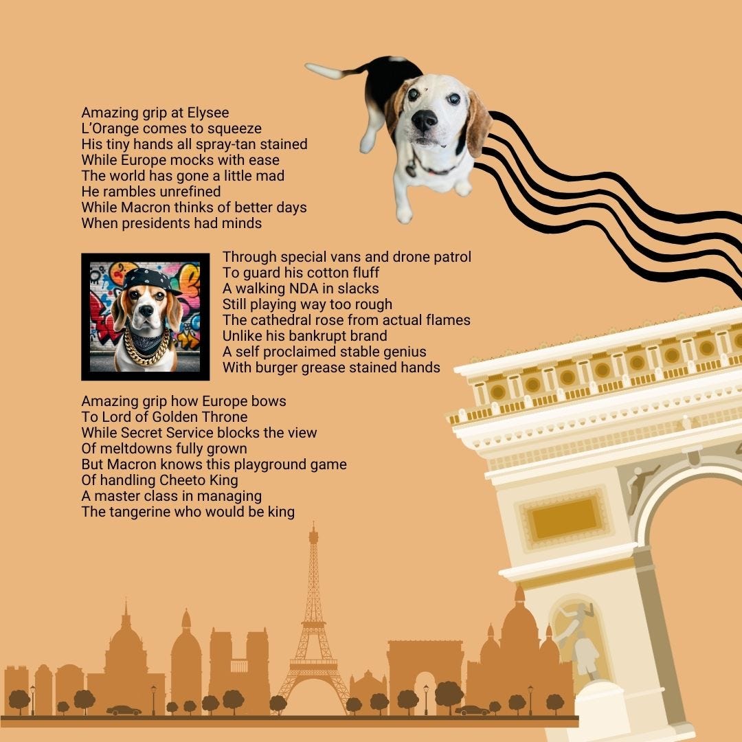 Amazing grip at Elysee L’Orange comes to squeeze His tiny hands all spray-tan stained While Europe mocks with ease The world has gone a little mad He rambles unrefined While Macron thinks of better days When presidents had minds Through special vans and drone patrol To guard his cotton fluff A walking NDA in slacks Still playing way too rough The cathedral rose from actual flames Unlike his bankrupt brand A self proclaimed stable genius With burger grease stained hands Amazing grip how Europe bows To Lord of Golden Throne While Secret Service blocks the view Of meltdowns fully grown But Macron knows this playground game Of handling Cheeto King A master class in managing The tangerine who would be king