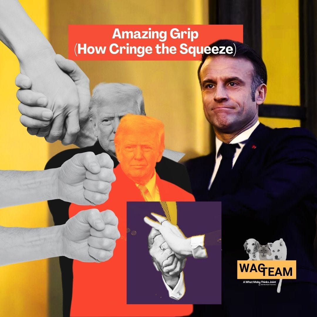 #WagTeam #AmazingGrip #MacronedAndCheese #DiplomaticDisasterpiece #HandshakeHorrors #MobyObserves #ParisInSighs #TreeingWalkerForPeace #MixtapeOnTheTitanic #OrangeYouCringe