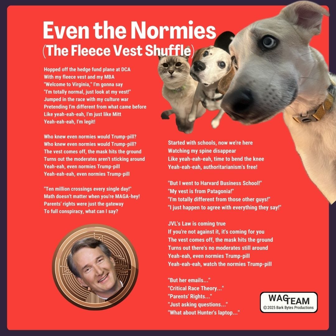 Hopped off the hedge fund plane at DCA With my fleece vest and my MBA "Welcome to Virginia," I'm gonna say "I'm totally normal, just look at my vest!" Jumped in the race with my culture war Pretending I'm different from what came before Like yeah-eah-eah, I'm just like Mitt Yeah-eah-eah, I'm legit! Who knew even normies would Trump-pill? Who knew even normies would Trump-pill? The vest comes off, the mask hits the ground Turns out the moderates aren't sticking around Yeah-eah, even normies Trump-pill Yeah-eah-eah, even normies Trump-pill "Ten million crossings every single day!" Math doesn't matter when you're MAGA-hey! Parents' rights were just the gateway To full conspiracy, what can I say? Started with schools, now we're here Watching my spine disappear Like yeah-eah-eah, time to bend the knee Yeah-eah-eah, authoritarianism's free! "But I went to Harvard Business School!" "My vest is from Patagonia!" "I'm totally different from those other guys!" "I just happen to agree with everything they say!" JVL's Law is coming true If you're not against it, it's coming for you The vest comes off, the mask hits the ground Turns out there's no moderates still around Yeah-eah, even normies Trump-pill Yeah-eah-eah, watch the normies Trump-pill "But her emails..." "Critical Race Theory..." "Parents' Rights..." "Just asking questions..." "What about Hunter's laptop..."