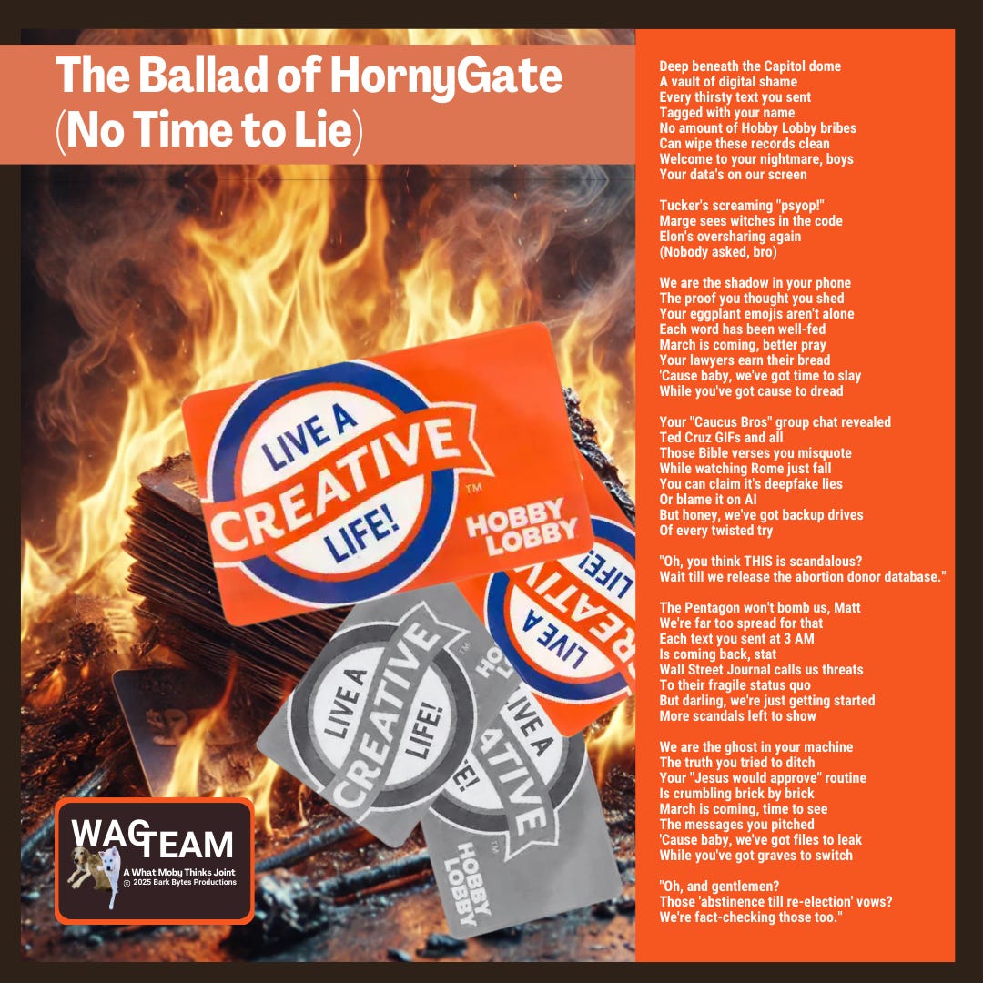 This new musical descent into American chaos comes hot on the heels of our previous hit about Congressional DMs. Think of it as a spiritual sequel - like "Godfather II" but with more eggplant emojis and fewer horse heads (I think - March revelations pending).