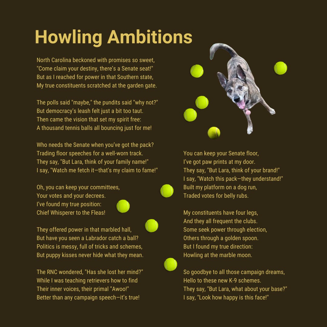 North Carolina beckoned with promises so sweet, "Come claim your destiny, there’s a Senate seat!" But as I reached for power in that Southern state, My true constituents scratched at the garden gate. The polls said "maybe," the pundits said "why not?" But democracy’s leash felt just a bit too taut. Then came the vision that set my spirit free: A thousand tennis balls all bouncing just for me! Who needs the Senate when you’ve got the pack? Trading floor speeches for a well-worn track. They say, "But Lara, think of your family name!" I say, "Watch me fetch it—that’s my claim to fame!" Oh, you can keep your committees, Your votes and your decrees. I’ve found my true position: Chief Whisperer to the Fleas! They offered power in that marbled hall, But have you seen a Labrador catch a ball? Politics is messy, full of tricks and schemes, But puppy kisses never hide what they mean. The RNC wondered, "Has she lost her mind?" While I was teaching retrievers how to find Their inner voices, their primal "Awoo!" Better than any campaign speech—it’s true! You can keep your Senate floor, I’ve got paw prints at my door. They say, "But Lara, think of your brand!" I say, "Watch this pack—they understand!" Built my platform on a dog run, Traded votes for belly rubs. My constituents have four legs, And they all frequent the clubs. Some seek power through election, Others through a golden spoon. But I found my true direction: Howling at the marble moon. So goodbye to all those campaign dreams, Hello to these new K-9 schemes. They say, "But Lara, what about your base?" I say, "Look how happy is this face!"