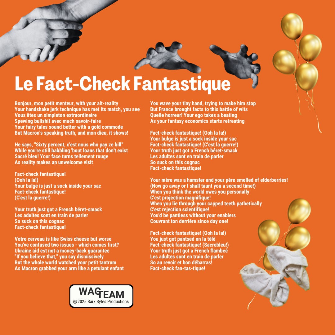 Bonjour, mon petit menteur, with your alt-reality Your handshake jerk technique has met its match, you see Vous êtes un simpleton extraordinaire Spewing bullshit avec much savoir-faire Your fairy tales sound better with a gold commode But Macron's speaking truth, and mon dieu, it shows! He says, "Sixty percent, c'est nous who pay ze bill" While you're still babbling 'bout loans that don't exist Sacré bleu! Your face turns tellement rouge As reality makes an unwelcome visit Fact-check fantastique! (Ooh la la!) Your bulge is just a sock inside your sac Fact-check fantastique! (C'est la guerre!) Your truth just got a French béret-smack Les adultes sont en train de parler So suck on this cognac Fact-check fantastique! Votre cerveau is like Swiss cheese but worse You've confused two issues - which comes first? Ukraine aid est not a money-back guarantee "If you believe that," you say dismissively But the whole world watched your petit tantrum As Macron grabbed your arm like a petulant enfant You wave your tiny hand, trying to make him stop But France brought facts to this battle of wits Quelle horreur! Your ego takes a beating As your fantasy economics starts retreating Fact-check fantastique! (Ooh la la!) Your bulge is just a sock inside your sac Fact-check fantastique! (C'est la guerre!) Your truth just got a French béret-smack Les adultes sont en train de parler So suck on this cognac Fact-check fantastique! Your mère was a hamster and your père smelled of elderberries! (Now go away or I shall taunt you a second time!) When you think the world owes you personally C'est projection magnifique! When you lie through your capped teeth pathetically C'est rejection scientifique! You'd be pantless without your enablers Couvrant ton derrière since day one! Fact-check fantastique! (Ooh la la!) You just got pantsed on la télé Fact-check fantastique! (Sacrebleu!) Your truth just got a French flambeé Les adultes sont en train de parler So au revoir et bon débarras! Fact-check fan-tas-tique!