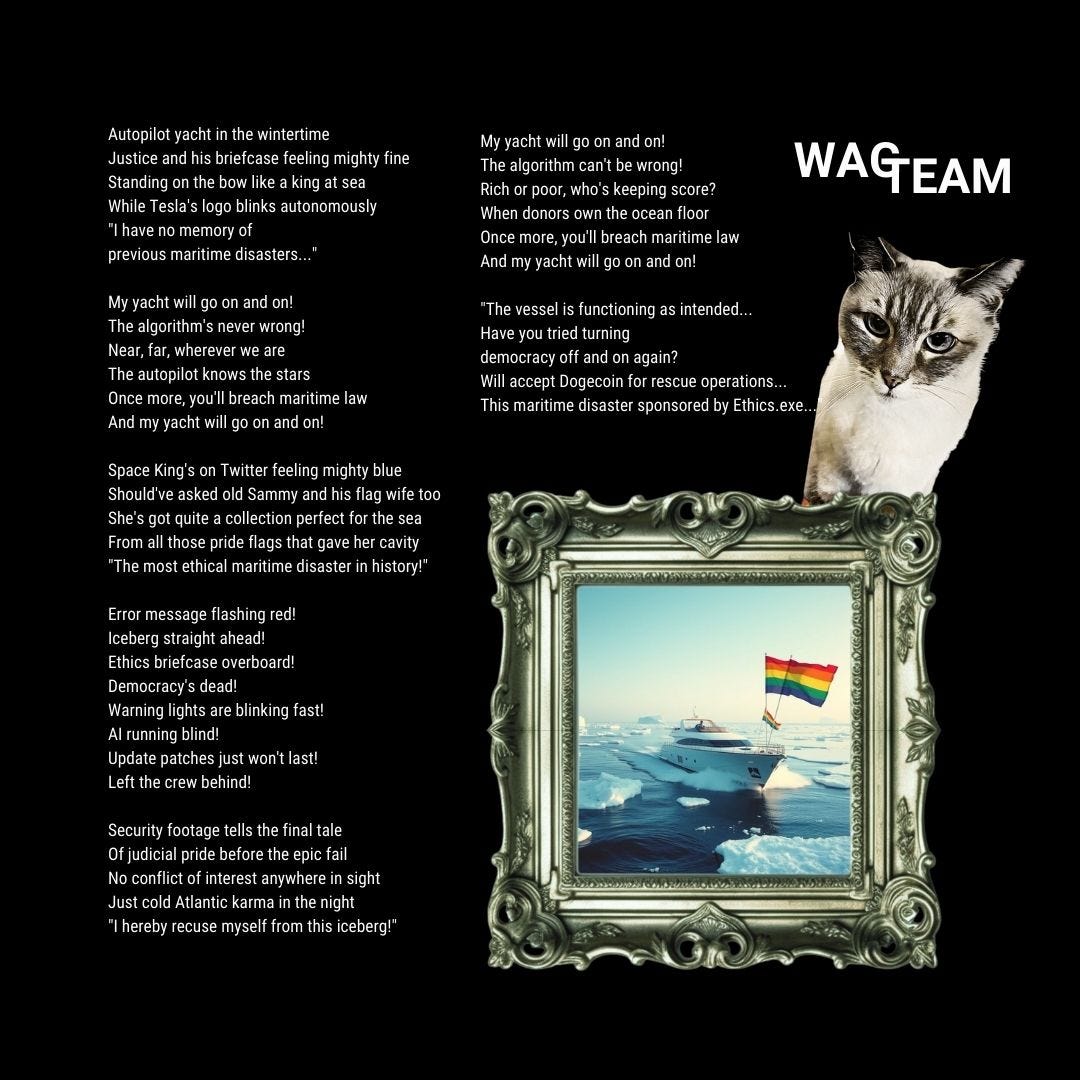 Autopilot yacht in the wintertime Justice and his briefcase feeling mighty fine Standing on the bow like a king at sea While Tesla's logo blinks autonomously "I have no memory of previous maritime disasters..." My yacht will go on and on! The algorithm's never wrong! Near, far, wherever we are The autopilot knows the stars Once more, you'll breach maritime law And my yacht will go on and on! Space King's on Twitter feeling mighty blue Should've asked old Sammy and his flag wife too She's got quite a collection perfect for the sea From all those pride flags that gave her cavity "The most ethical maritime disaster in history!" Error message flashing red! Iceberg straight ahead! Ethics briefcase overboard! Democracy's dead! Warning lights are blinking fast! AI running blind! Update patches just won't last! Left the crew behind! Security footage tells the final tale Of judicial pride before the epic fail No conflict of interest anywhere in sight Just cold Atlantic karma in the night "I hereby recuse myself from this iceberg!" My yacht will go on and on! The algorithm can't be wrong! Rich or poor, who's keeping score? When donors own the ocean floor Once more, you'll breach maritime law And my yacht will go on and on! "The vessel is functioning as intended... Have you tried turning democracy off and on again? Will accept Dogecoin for rescue operations... This maritime disaster sponsored by Ethics.exe..."