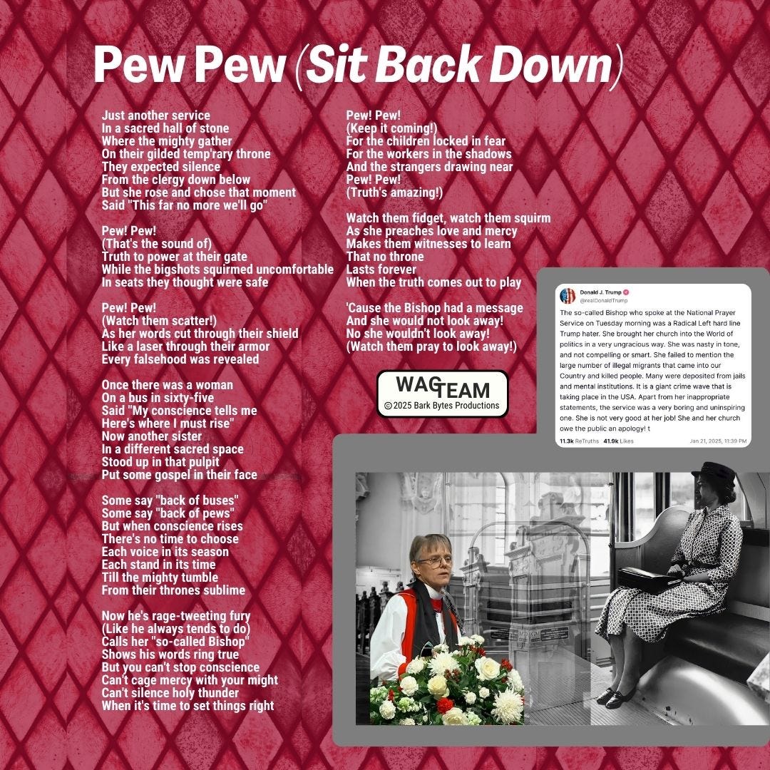 Just another service In a sacred hall of stone Where the mighty gather On their gilded temp'rary throne They expected silence From the clergy down below But she rose and chose that moment Said "This far no more we'll go" Pew! Pew! (That's the sound of) Truth to power at their gate While the bigshots squirmed uncomfortable In seats they thought were safe Pew! Pew! (Watch them scatter!) As her words cut through their shield Like a laser through their armor Every falsehood was revealed Once there was a woman On a bus in sixty-five Said "My conscience tells me Here's where I must rise" Now another sister In a different sacred space Stood up in that pulpit Put some gospel in their face Some say "back of buses" Some say "back of pews" But when conscience rises There's no time to choose Each voice in its season Each stand in its time Till the mighty tumble From their thrones sublime Now he's rage-tweeting fury (Like he always tends to do) Calls her "so-called Bishop" Shows his words ring true But you can't stop conscience Can't cage mercy with your might Can't silence holy thunder When it's time to set things right Pew! Pew! (Keep it coming!) For the children locked in fear For the workers in the shadows And the strangers drawing near Pew! Pew! (Truth's amazing!) Watch them fidget, watch them squirm As she preaches love and mercy Makes them witnesses to learn That no throne Lasts forever When the truth comes out to play 'Cause the Bishop had a message And she would not look away! No she wouldn't look away! (Watch them pray to look away!)