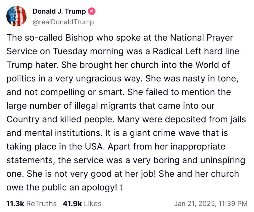 Bishop Mariann Edgar Budde steps up to the pulpit, her voice calm but firm. (If this language seems a bit stilted, I’m paraphrasing some from ChatGPT - I just couldn’t EVEN).