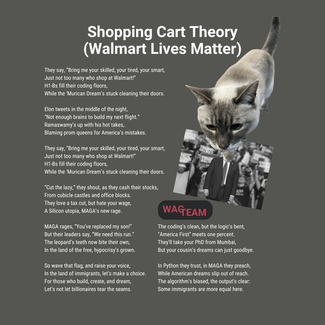 They say, “Bring me your skilled, your tired, your smart, Just not too many who shop at Walmart!” H1-Bs fill their coding floors, While the ‘Murican Dream’s stuck cleaning their doors. Elon tweets in the middle of the night, “Not enough brains to build my next flight.” Ramaswamy’s up with his hot takes, Blaming prom queens for America’s mistakes. They say, “Bring me your skilled, your tired, your smart, Just not too many who shop at Walmart!” H1-Bs fill their coding floors, While the ‘Murican Dream’s stuck cleaning their doors. “Cut the lazy,” they shout, as they cash their stocks, From cubicle castles and office blocks. They love a tax cut, but hate your wage, A Silicon utopia, MAGA’s new rage. MAGA rages, “You’ve replaced my son!” But their leaders say, “We need this run.” The leopard’s teeth now bite their own, In the land of the free, hypocrisy’s grown. So wave that flag, and raise your voice, In the land of immigrants, let’s make a choice. For those who build, create, and dream, Let’s not let billionaires tear the seams. The coding's clean, but the logic's bent, "America First" meets one percent. They'll take your PhD from Mumbai, But your cousin's dreams can just goodbye. In Python they trust, in MAGA they preach, While American dreams slip out of reach. The algorithm's biased, the output's clear: Some immigrants are more equal here.