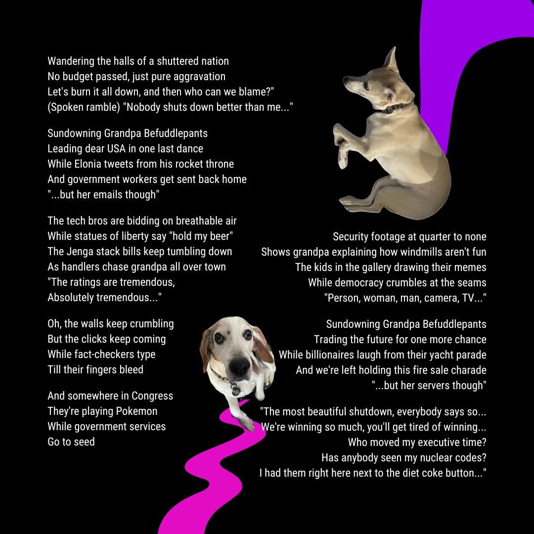 Wandering the halls of a shuttered nation No budget passed, just pure aggravation Let's burn it all down, and then who can we blame?" (Spoken ramble) "Nobody shuts down better than me..." Sundowning Grandpa Befuddlepants Leading dear USA in one last dance While Elonia tweets from his rocket throne And government workers get sent back home "...but her emails though" The tech bros are bidding on breathable air While statues of liberty say "hold my beer" The Jenga stack bills keep tumbling down As handlers chase grandpa all over town "The ratings are tremendous, Absolutely tremendous..." Oh, the walls keep crumbling But the clicks keep coming While fact-checkers type Till their fingers bleed And somewhere in Congress They're playing Pokemon While government services Go to seed Security footage at quarter to none Shows grandpa explaining how windmills aren't fun The kids in the gallery drawing their memes While democracy crumbles at the seams "Person, woman, man, camera, TV..." Sundowning Grandpa Befuddlepants Trading the future for one more chance While billionaires laugh from their yacht parade And we're left holding this fire sale charade "...but her servers though" "The most beautiful shutdown, everybody says so... We're winning so much, you'll get tired of winning... Who moved my executive time? Has anybody seen my nuclear codes? I had them right here next to the diet coke button..."