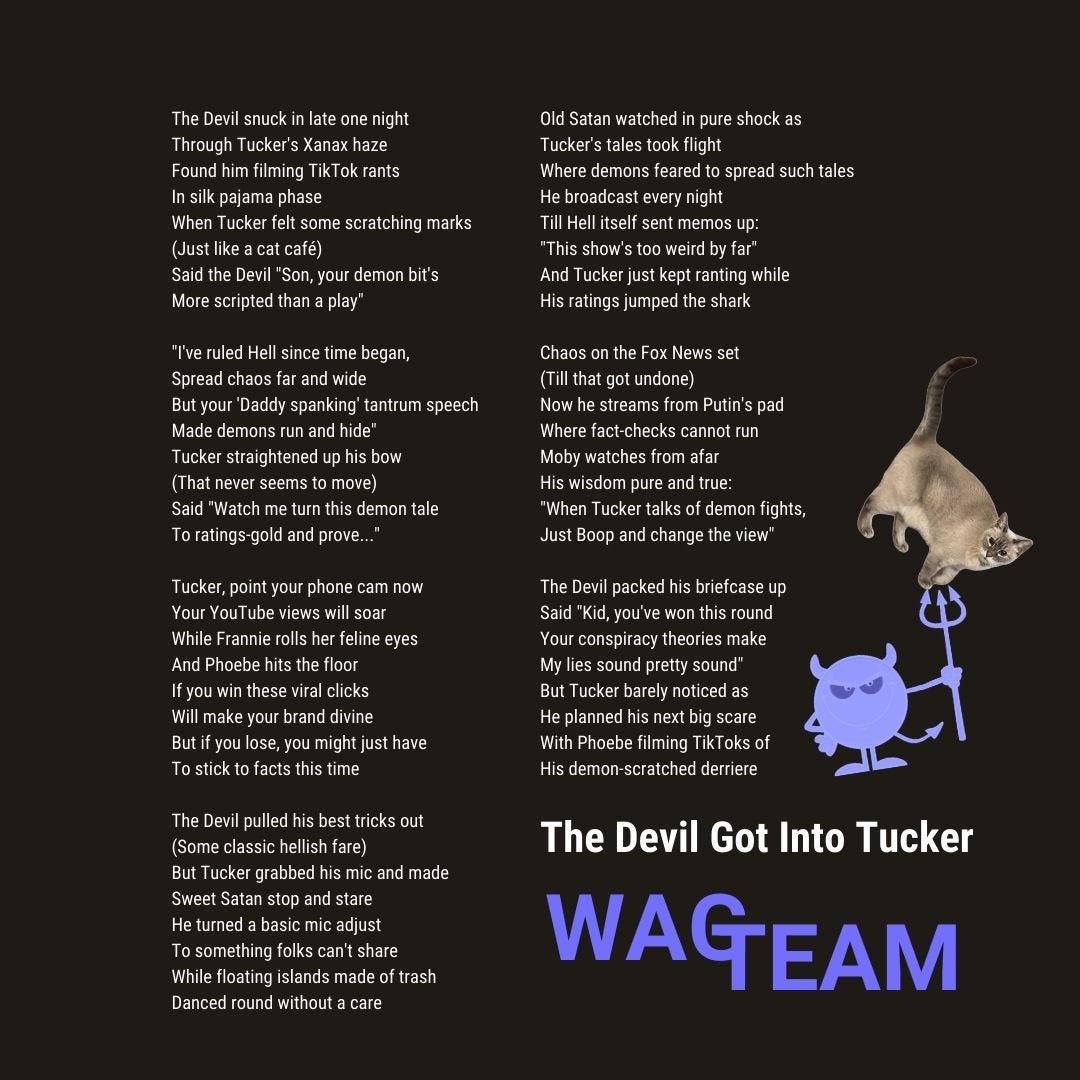 The Devil snuck* in late one night Through Tucker's Xanax haze Found him filming TikTok rants In silk pajama phase When Tucker felt some scratching marks (Just like a cat café) Said the Devil "Son, your demon bit's More scripted than a play" "I've ruled Hell since time began, Spread chaos far and wide But your 'Daddy spanking' tantrum speech Made demons run and hide" Tucker straightened up his bow (That never seems to move) Said "Watch me turn this demon tale To ratings-gold and prove..." Tucker, point your phone cam now Your YouTube views will soar While Frannie rolls her feline eyes And Phoebe hits the floor If you win these viral clicks Will make your brand divine But if you lose, you might just have To stick to facts this time The Devil pulled his best tricks out (Some classic hellish fare) But Tucker grabbed his mic and made Sweet Satan stop and stare He turned a basic mic adjust To something folks can't share While floating islands made of trash Danced round without a care Old Satan watched in pure shock as Tucker's tales took flight Where demons feared to spread such tales He broadcast every night Till Hell itself sent memos up: "This show's too weird by far" And Tucker just kept ranting while His ratings jumped the shark Chaos on the Fox News set (Till that got undone) Now he streams from Putin's pad Where fact-checks cannot run Moby watches from afar His wisdom pure and true: "When Tucker talks of demon fights, Just Boop and change the view" The Devil packed his briefcase up Said "Kid, you've won this round Your conspiracy theories make My lies sound pretty sound" But Tucker barely noticed as He planned his next big scare With Phoebe filming TikToks of His demon-scractched derriere *snuck - I know it’s “sneaked” - I needed the single-syllable word. It’s ok.
