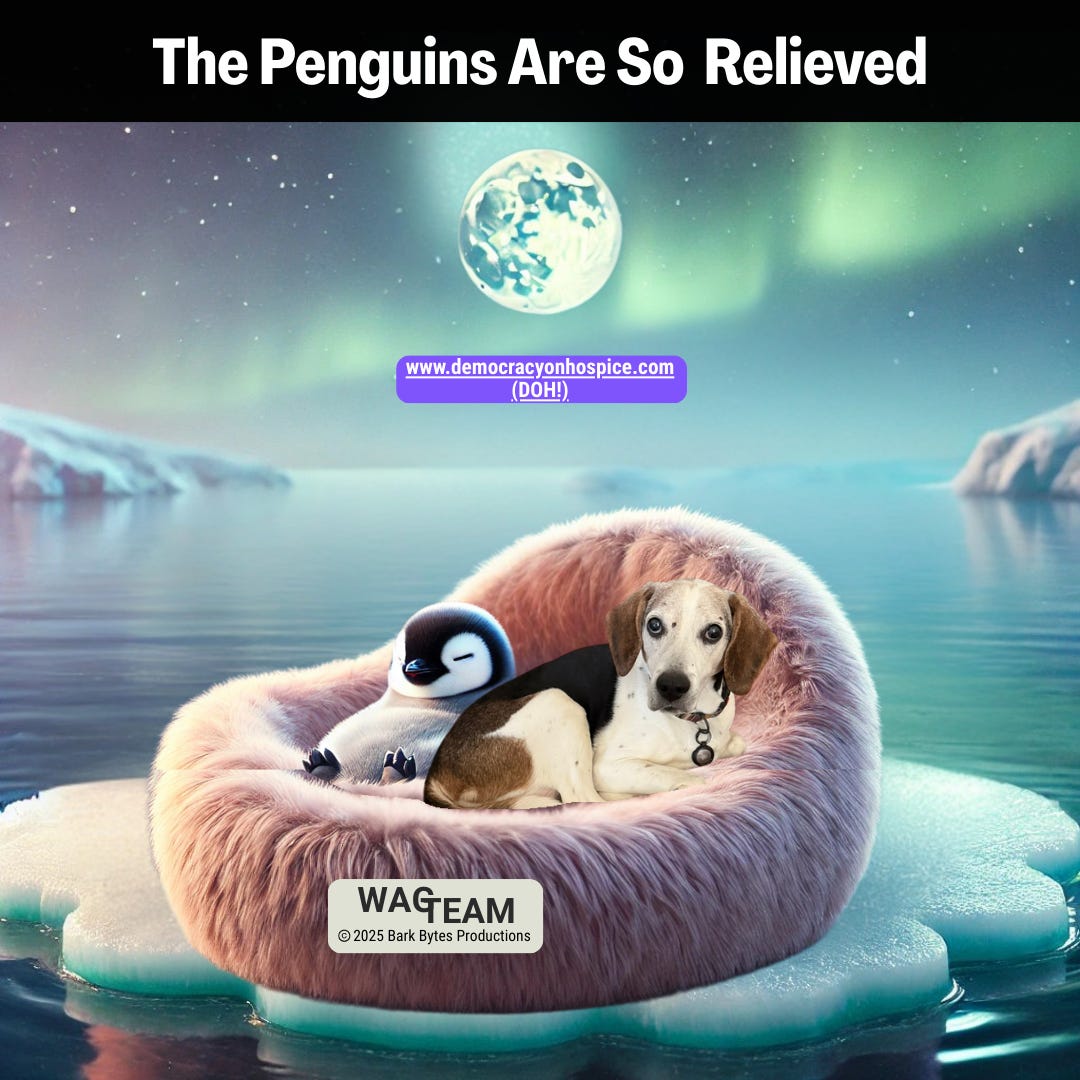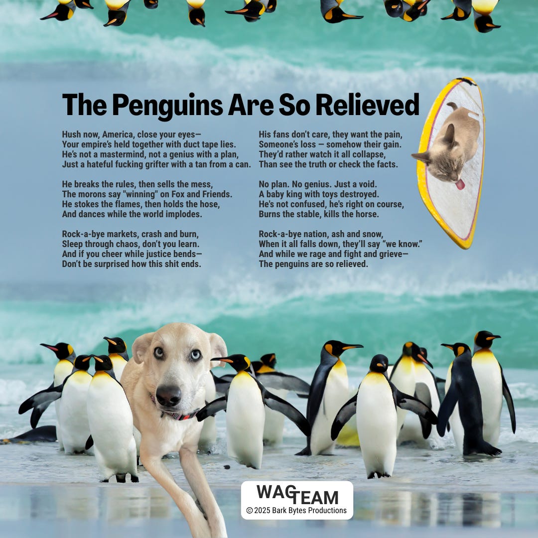 Hush now, America, close your eyes— Your empire’s held together with duct tape lies. He’s not a mastermind, not a genius with a plan, Just a hateful fucking grifter with a tan from a can. He breaks the rules, then sells the mess, The morons say "winning" on Fox and Friends. He stokes the flames, then holds the hose, And dances while the world implodes. Rock-a-bye markets, crash and burn, Sleep through chaos, don’t you learn. And if you cheer while justice bends— Don’t be surprised how this shit ends. His fans don’t care, they want the pain, Someone’s loss — somehow their gain. They’d rather watch it all collapse, Than see the truth or check the facts. No plan. No genius. Just a void. A baby king with toys destroyed. He's not confused, he's right on course, Burns the stable, kills the horse. Rock-a-bye nation, ash and snow, When it all falls down, they’ll say “we know.” And while we rage and fight and grieve— The penguins are so relieved.