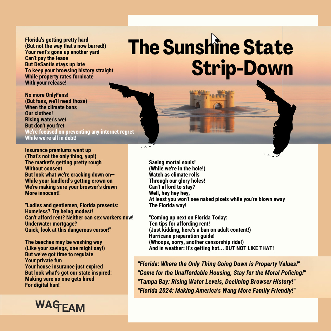 Florida's getting pretty hard (But not the way that's now barred!) Your rent's gone up another yard Can't pay the lease But DeSantis stays up late To keep your browsing history straight While property rates fornicate With your release! No more OnlyFans! (But fans, we'll need those) When the climate bans Our clothes! Rising water's wet But don't you fret We're focused on preventing any internet regret While we're all in debt! Insurance premiums went up (That's not the only thing, yup!) The market's getting pretty rough Without consent But look what we're cracking down on— While your landlord's getting crown on We're making sure your browser's drawn More innocent! "Ladies and gentlemen, Florida presents: Homeless? Try being modest! Can't afford rent? Neither can sex workers now! Underwater mortgage? Quick, look at this dangerous cursor!" The beaches may be washing way (Like your savings, one might say!) But we've got time to regulate Your private fun Your house insurance just expired But look what's got our state inspired: Making sure no one gets hired For digital hun! Saving mortal souls! (While we're in the hole!) Watch as climate rolls Through our glory holes! Can't afford to stay? Well, hey hey hey, At least you won't see naked pixels while you're blown away The Florida way! "Coming up next on Florida Today: Ten tips for affording rent! (Just kidding, here's a ban on adult content!) Hurricane preparation guide! (Whoops, sorry, another censorship ride!) And in weather: It's getting hot... BUT NOT LIKE THAT! "Florida: Where the Only Thing Going Down is Property Values!" "Come for the Unaffordable Housing, Stay for the Moral Policing!" "Tampa Bay: Rising Water Levels, Declining Browser History!" "Florida 2024: Making America's Wang More Family Friendly!"