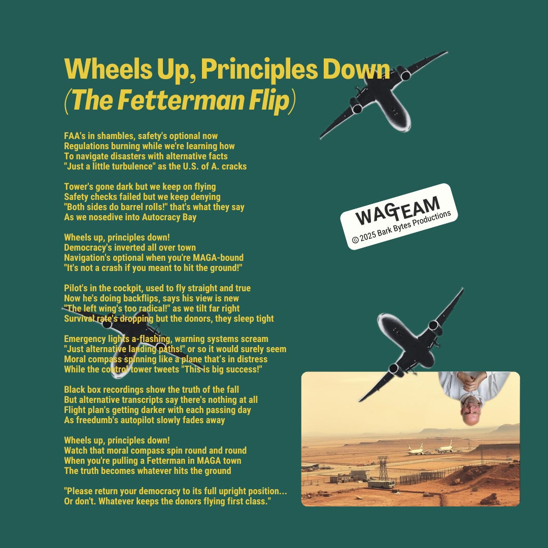 FAA's in shambles, safety's optional now Regulations burning while we're learning how To navigate disasters with alternative facts "Just a little turbulence" as the U.S. of A. cracks Tower's gone dark but we keep on flying Safety checks failed but we keep denying "Both sides do barrel rolls!" that's what they say As we nosedive into Autocracy Bay Wheels up, principles down! Democracy's inverted all over town Navigation's optional when you're MAGA-bound "It's not a crash if you meant to hit the ground!" Pilot's in the cockpit, used to fly straight and true Now he's doing backflips, says his view is new "The left wing's too radical!" as we tilt far right Survival rate's dropping but the donors, they sleep tight Emergency lights a-flashing, warning systems scream "Just alternative landing paths!" or so it would surely seem Moral compass spinning like a plane that’s in distress While the control tower tweets "This is big success!" Black box recordings show the truth of the fall But alternative transcripts say there's nothing at all Flight plan's getting darker with each passing day As freedumb's autopilot slowly fades away Wheels up, principles down! Watch that moral compass spin round and round When you're pulling a Fetterman in MAGA town The truth becomes whatever hits the ground "Please return your democracy to its full upright position... Or don't. Whatever keeps the donors flying first class."
